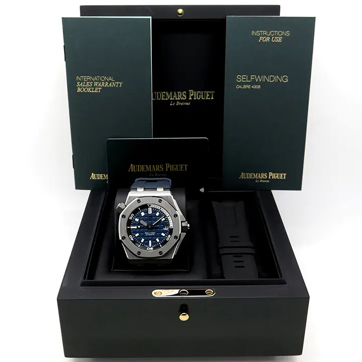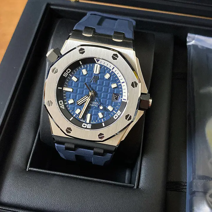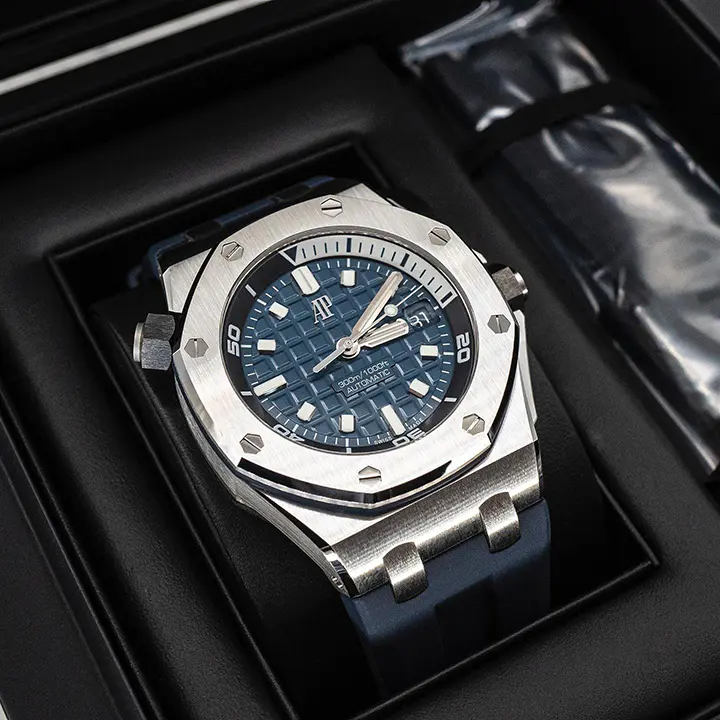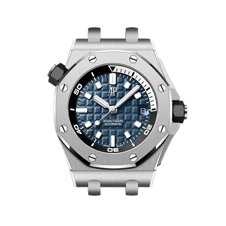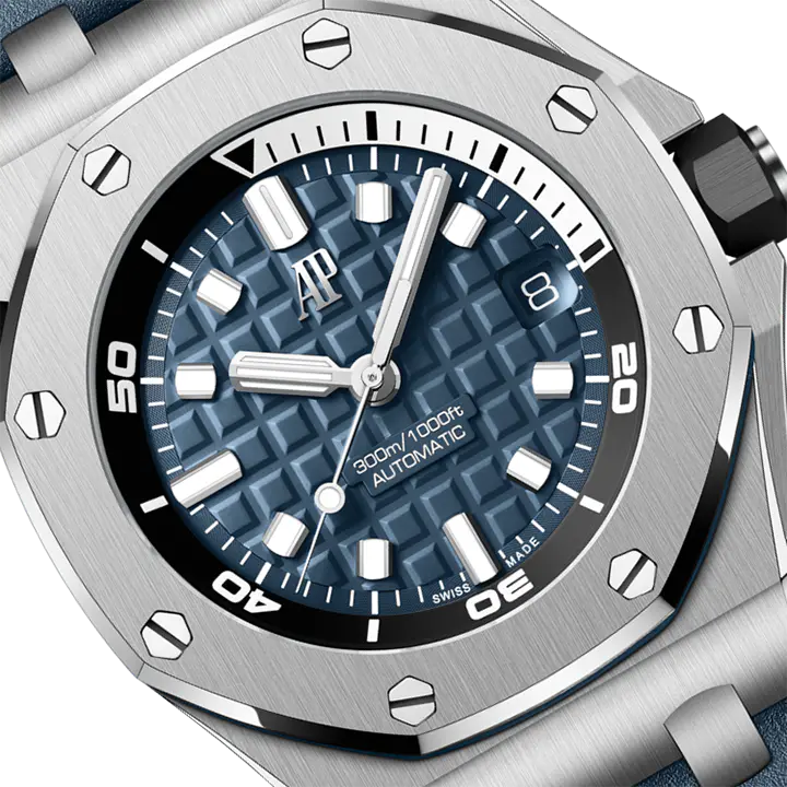 Blue dial with “Méga Tapisserie” pattern, white gold applied hour-markers and Royal Oak hands with luminescent coating, black rotating inner bezel with zone from 60 to 15 minutes in white