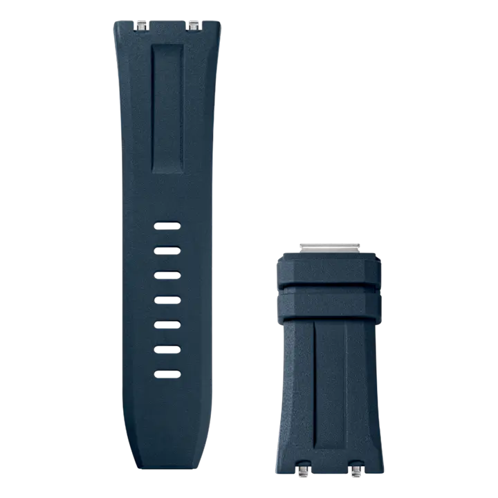 Blue rubber strap with stainless steel pin buckle and interchangeable strap system. Additional black rubber strap