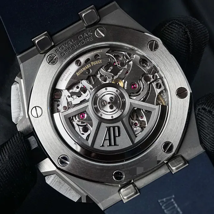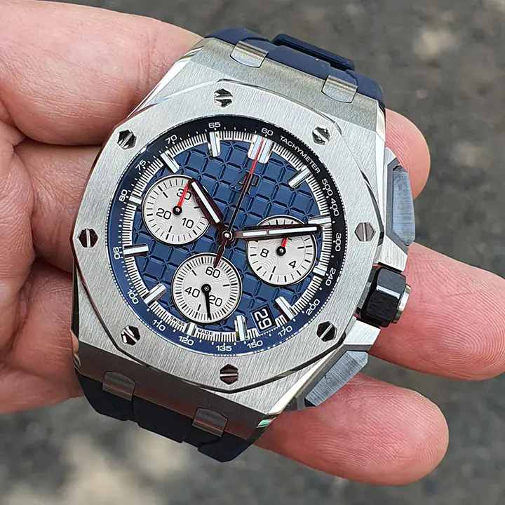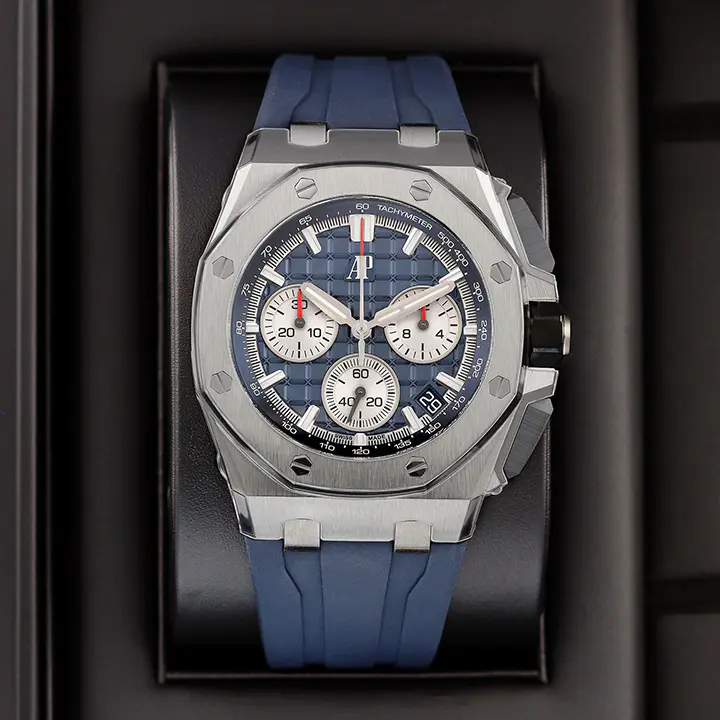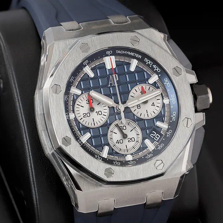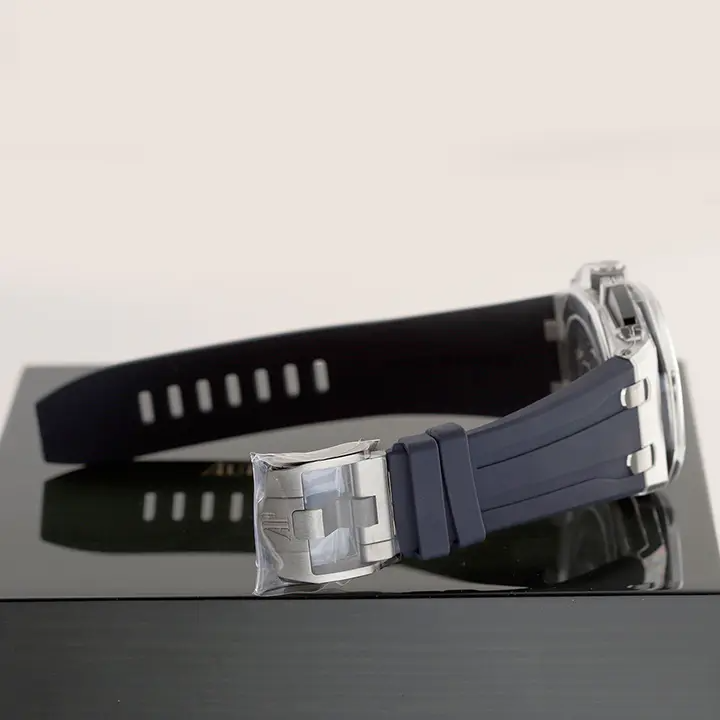 Blue rubber strap with titanium AP pin buckle and interchangeable strap system. Additional black rubber strap
