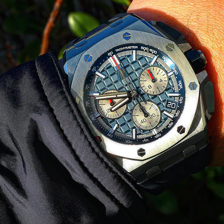 This all-titanium Royal Oak Offshore in 43 mm sports a blue "Méga Tapisserie" dial with high-end finishing as well as the Manufacture’s interchangeable strap system and latest integrated flyback chronograph.