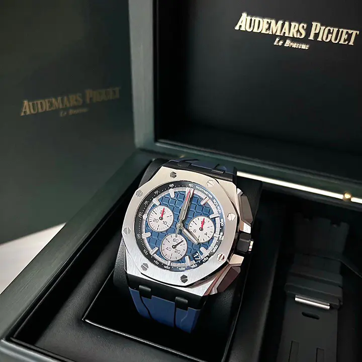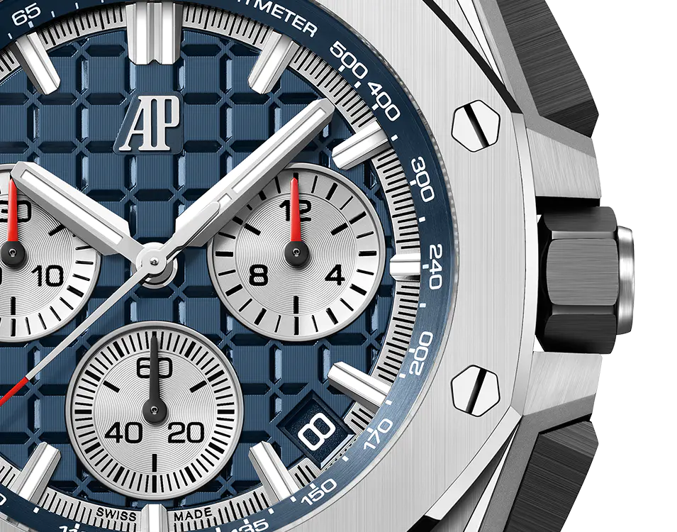 Blue dial with “Méga Tapisserie” pattern, rhodium-toned counters and external zone, white gold applied hour-markers and Royal Oak hands with luminescent coating, blue inner bezel