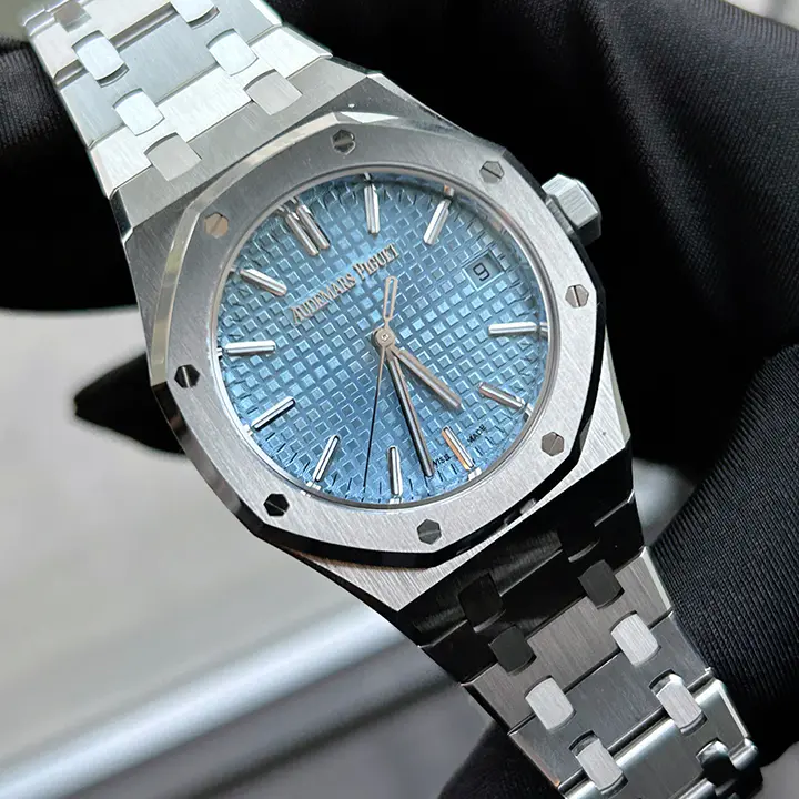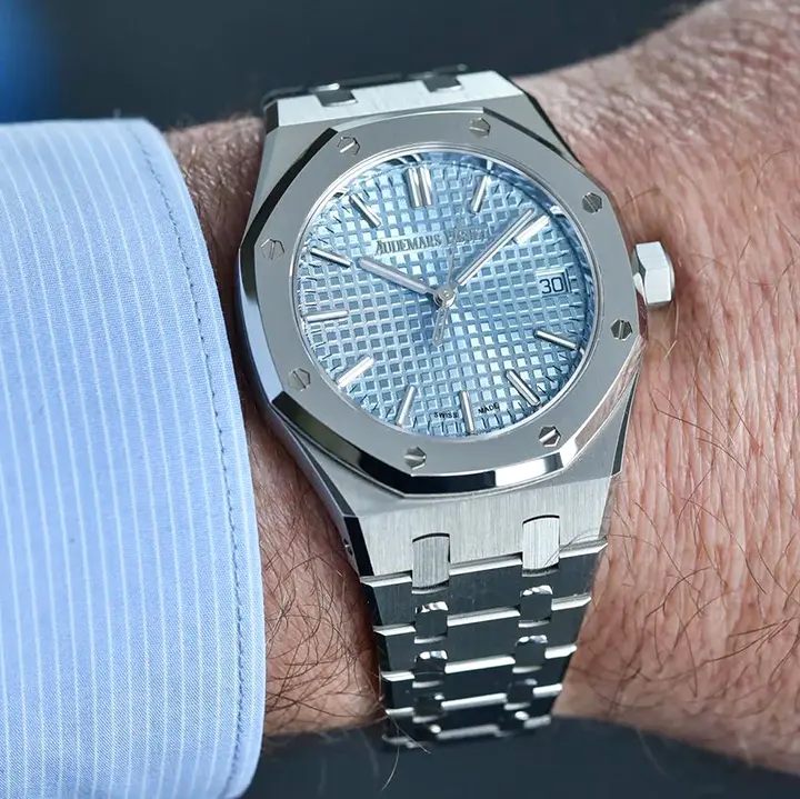 In addition to showcasing the new Royal Oak design evolution, this 37 mm stainless steel timepiece adorns a light blue “Grande Tapisserie” dial. The model is equipped with the new selfwinding Calibre 5900 and the "50-years" oscillating weight in rhodium-toned pink gold.