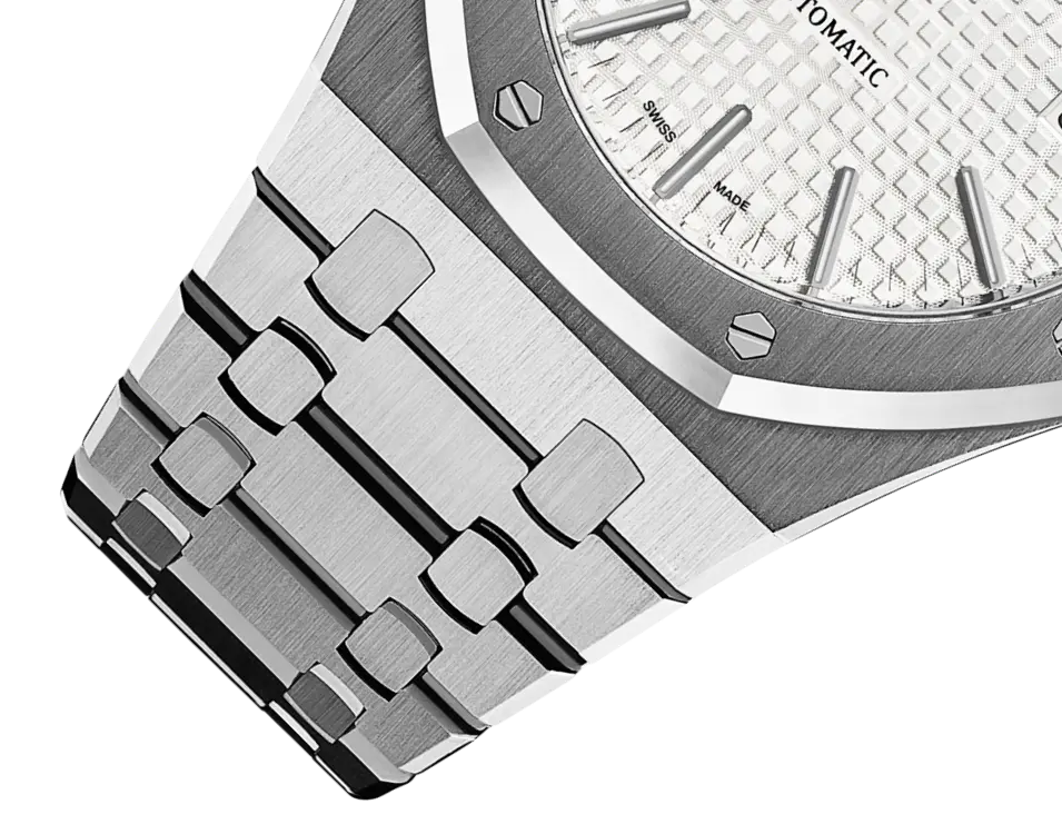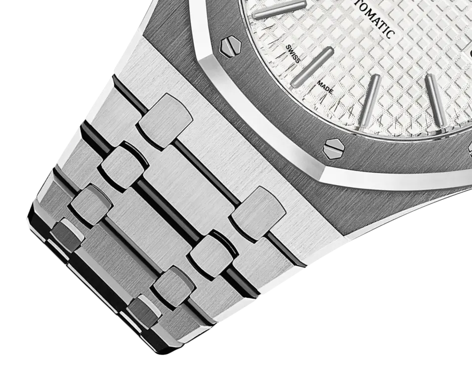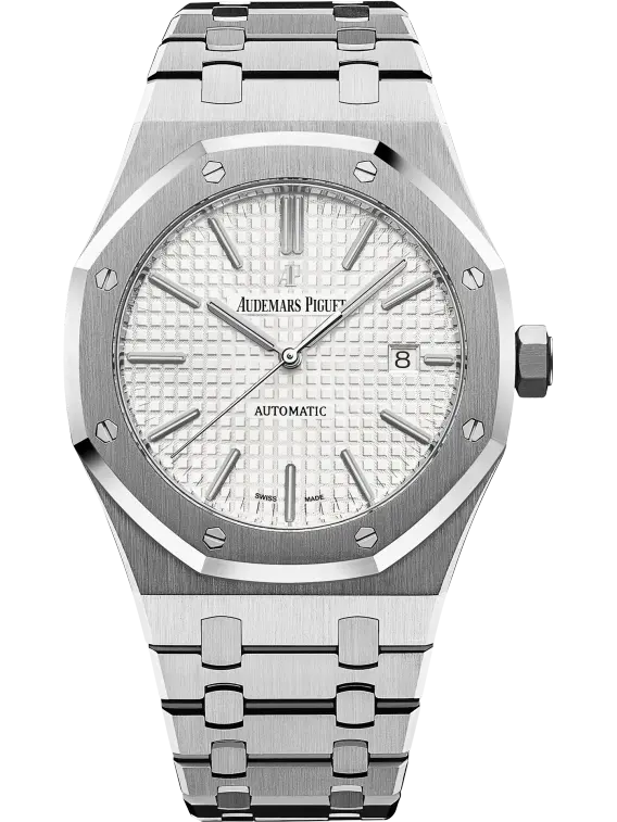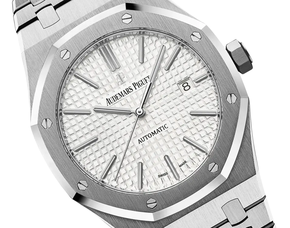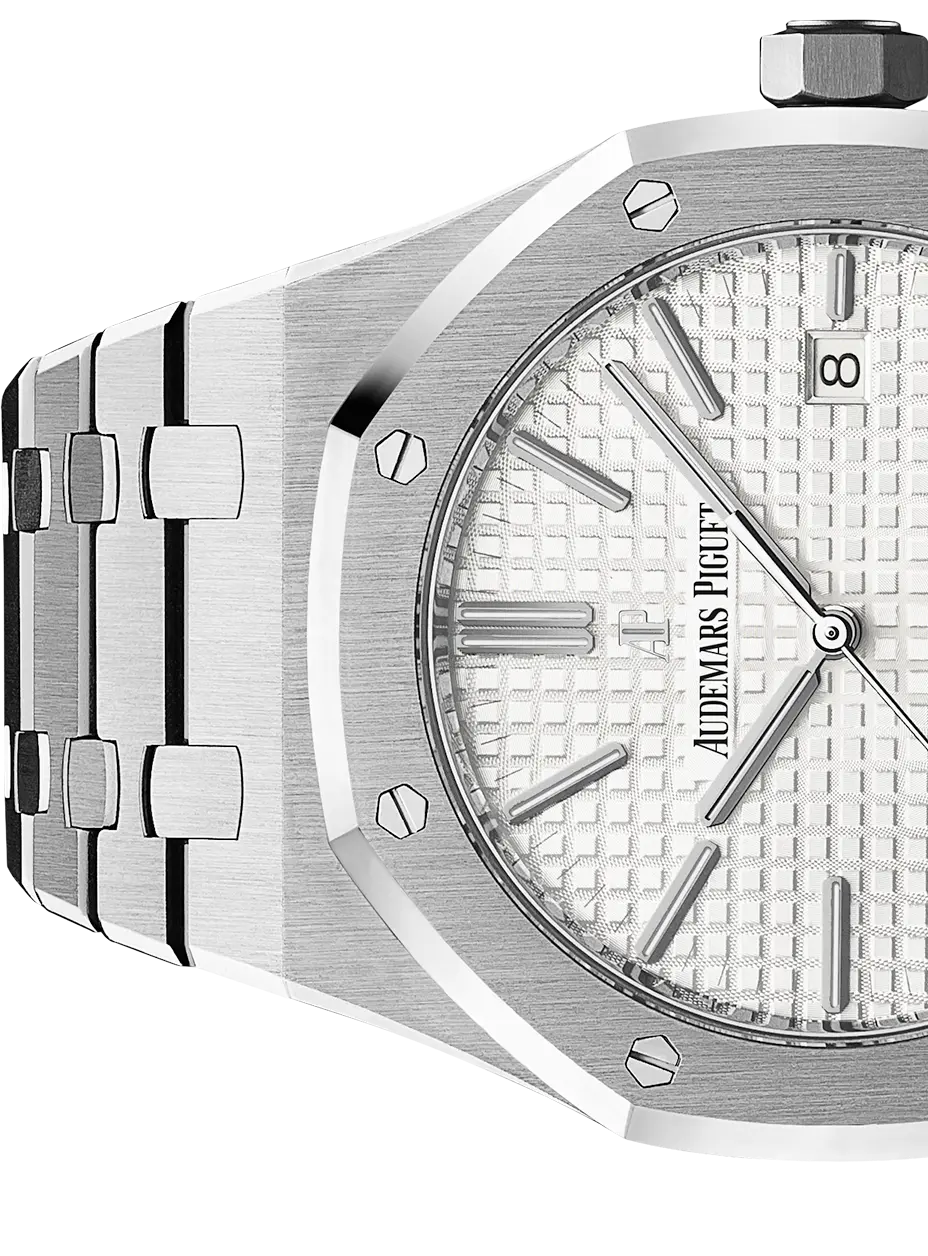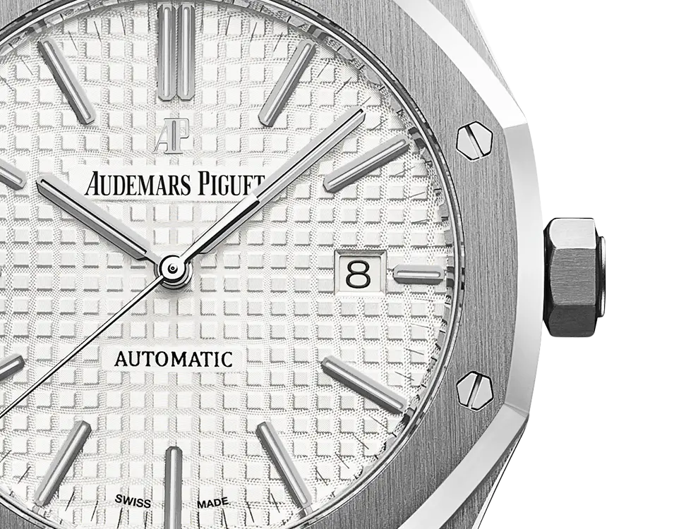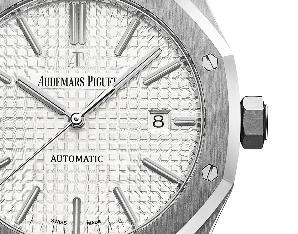 Silver-toned dial with “Grande Tapisserie” pattern, white gold applied hour-markers and Royal Oak hands with luminescent coating