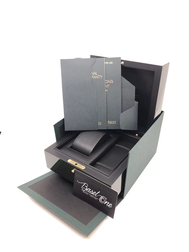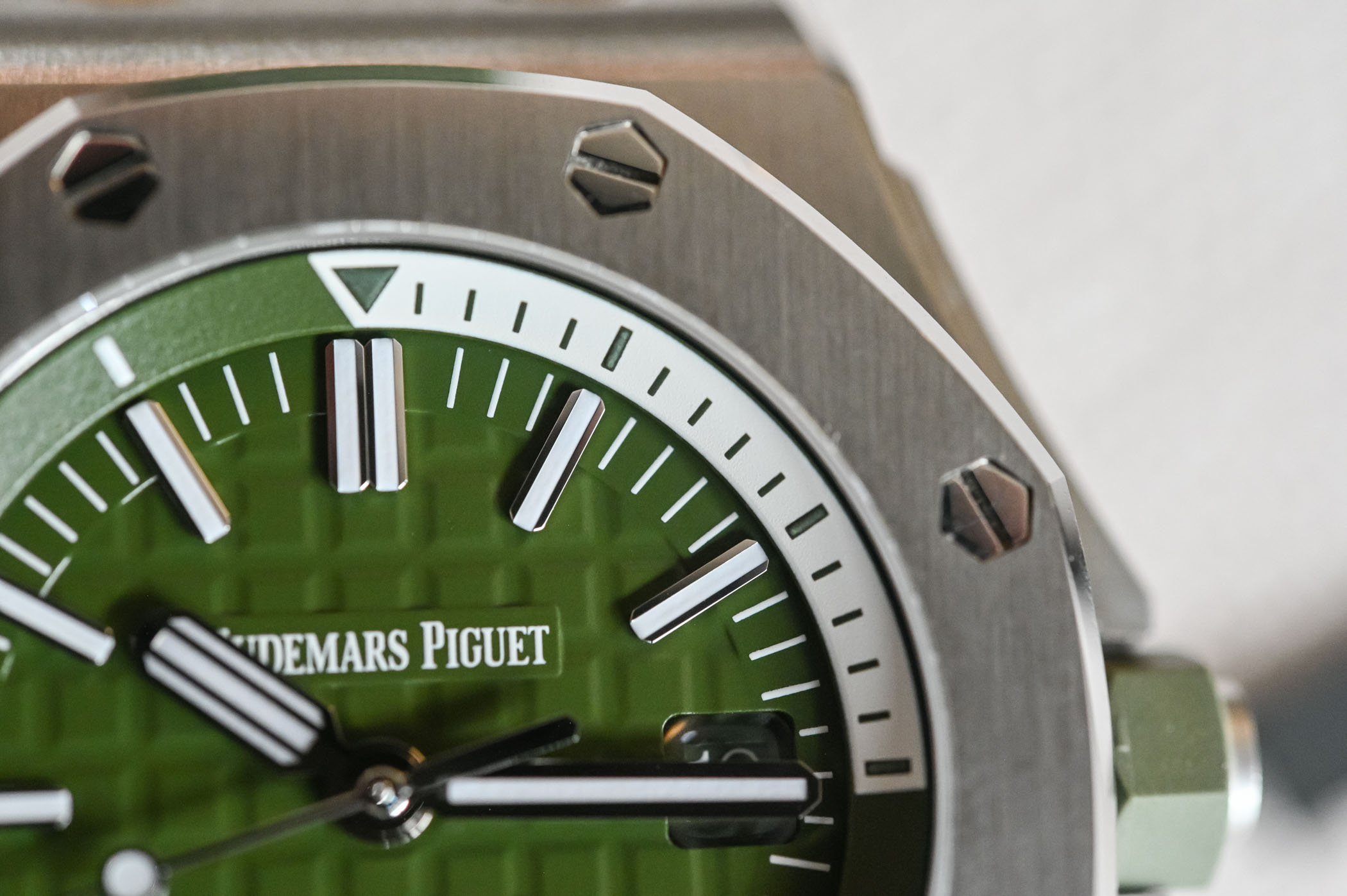 Khaki dial with “Méga Tapisserie” pattern, white gold applied hour-markers and Royal Oak hands with luminescent coating, khaki rotating inner bezel with zone from 60 to 15 minutes in white.