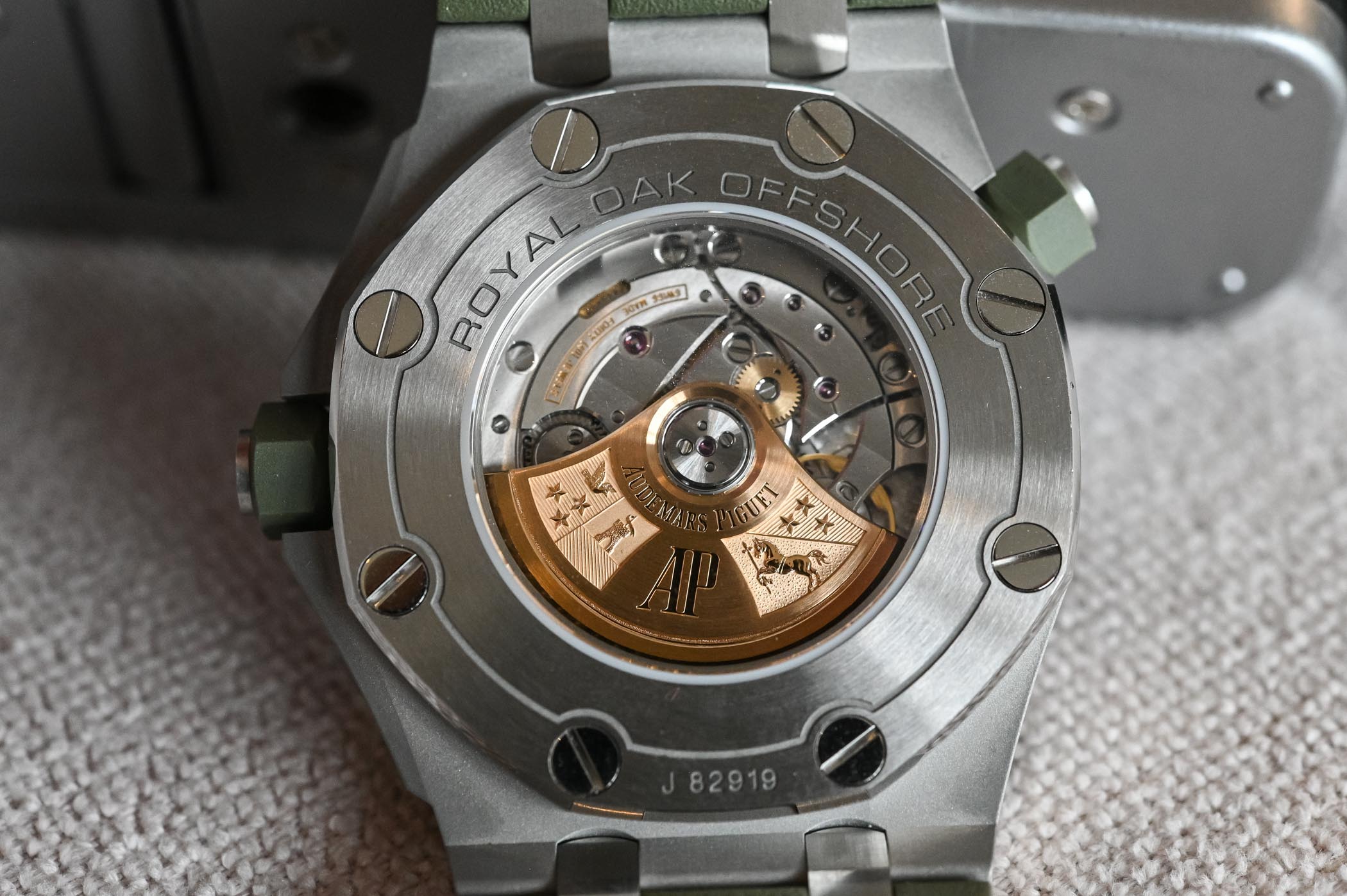 Although we have become accustomed to 42mm cases on sports watches, the dynamic and distinguishing architecture of the Royal Oak Offshore never fails to impress. The raised octagonal bezel with its vertical brushed finish and bevelled polished edges, the eight exposed hexagonal screws, the solid middle case and crown guards all transmit a reassuring sense of solidity. The two screw-locked crowns, one at 3 o’clock for winding and setting the time and the other at 10 o’clock to rotate the inner bezel are both covered in khaki rubber.