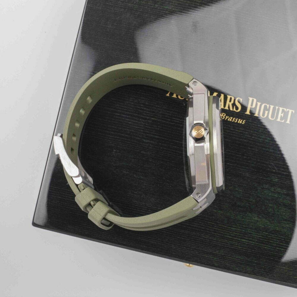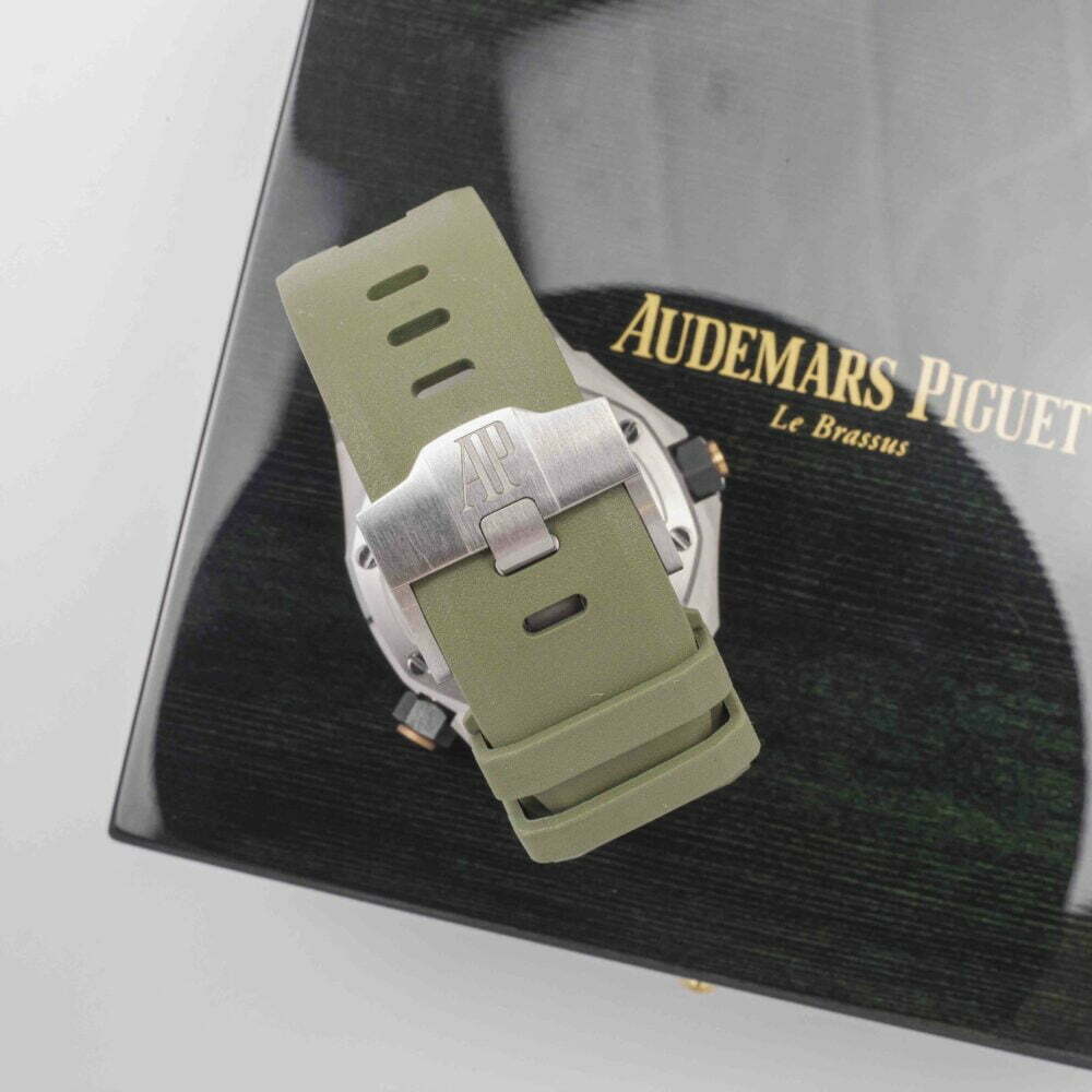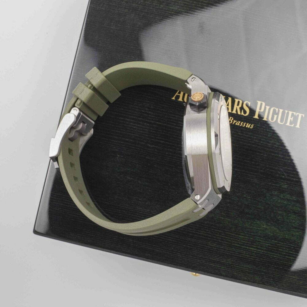 The ‘mega tapisserie’ or chequerboard pattern on the dial is khaki as is the area marking the 15-60 minutes on the internal bezel. The all-important 0-15 minutes zone for divers is white with green markings. Both the hour markers and hands are made from white gold and treated with luminescent coating. I particularly like the way the date window at 3 o’clock echoes the cushion-shaped squares of the dial and the judicious use of a khaki background that helps it fuse into the scenery without creating too much of an eye-sore. Like all Royal Oak Offshore models, the strap is integrated and flows seamlessly from the case. The khaki rubber strap is attached to the wrist with a stainless steel pin buckle and features two grooves that emanate from the flexible lugs.