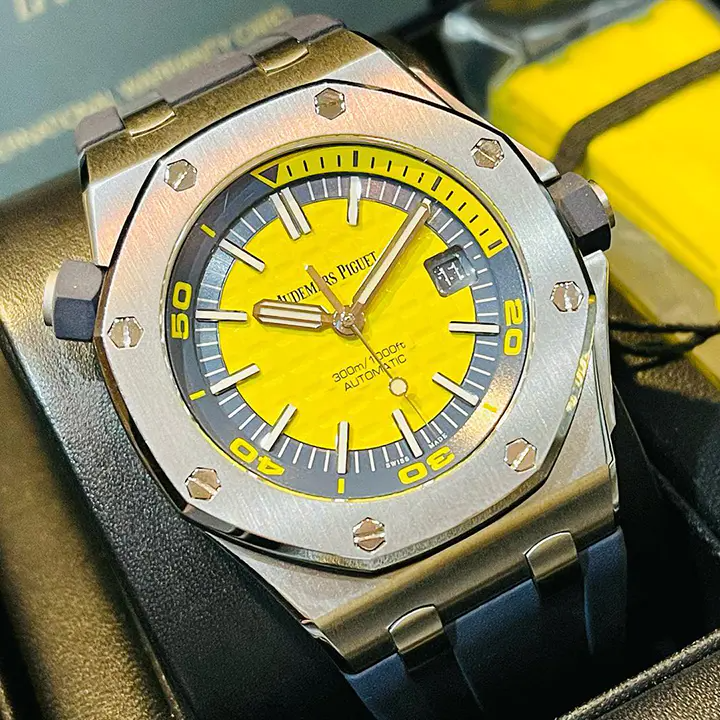 Yellow dial with “Méga Tapisserie” pattern, white gold applied hour-markers and Royal Oak hands with luminescent coating, blue rotating inner bezel with diving scale and zone from 60 to 15 minutes in yellow.