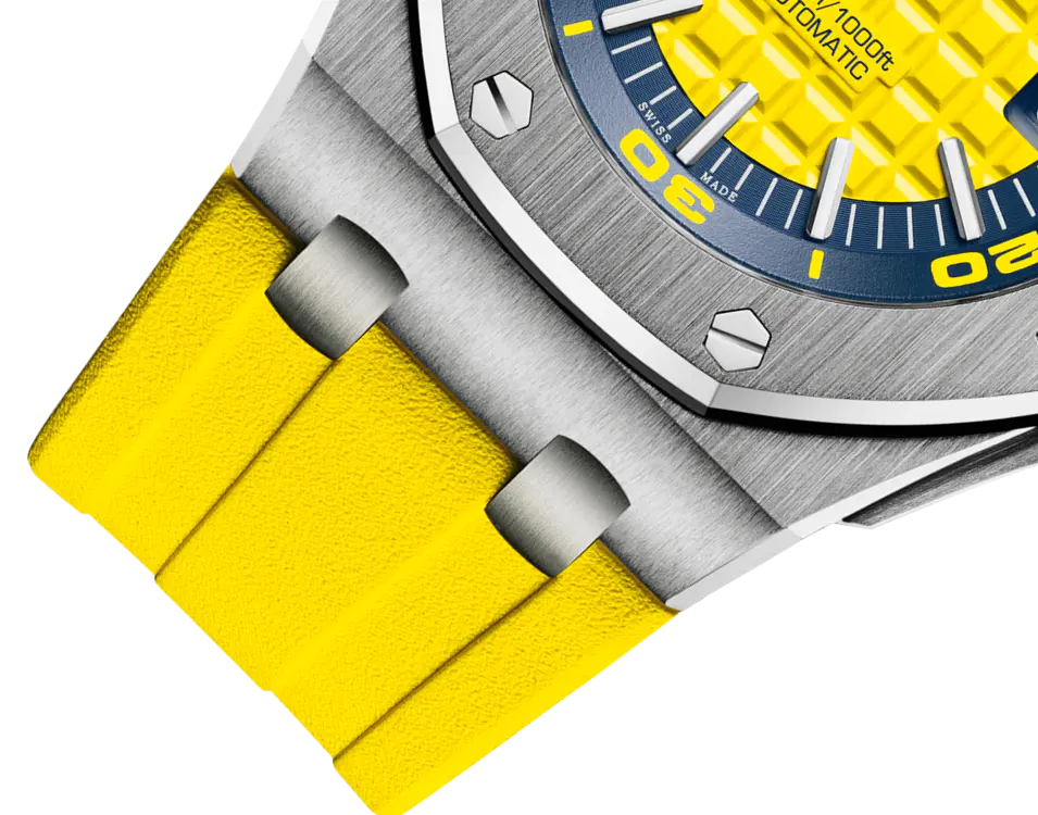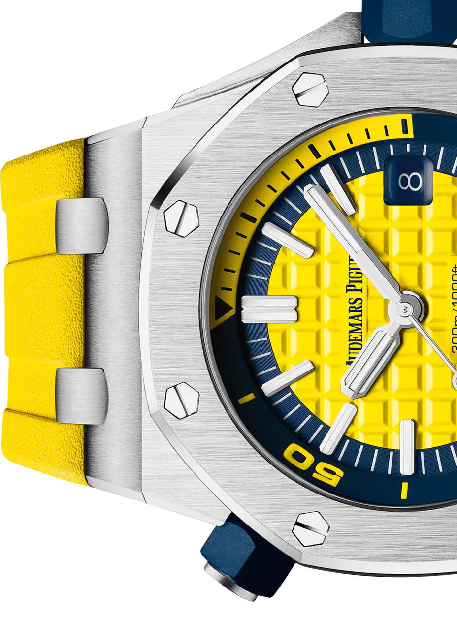 Perfect legibility in and out of the water with this fun and ‘funky’ new Royal Oak Offshore Diver. The Royal Offshore’s signature “Méga Tapisserie” checkerboard patterned dial is in bright yellow, harmoniously balanced with a blue rotating inner bezel. Two perfect-fit diving straps are provided, in matching yellow or blue.