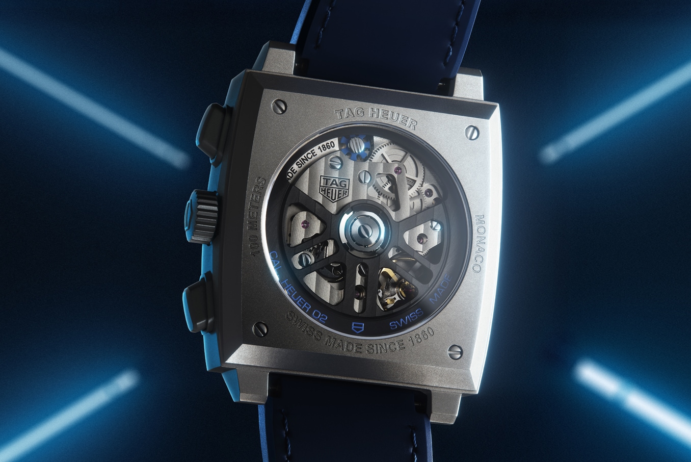 Powered by the in-house Heuer 02 movement, the signature square titanium grade 2 case reveals its dedicated column wheel and oscillating mass.