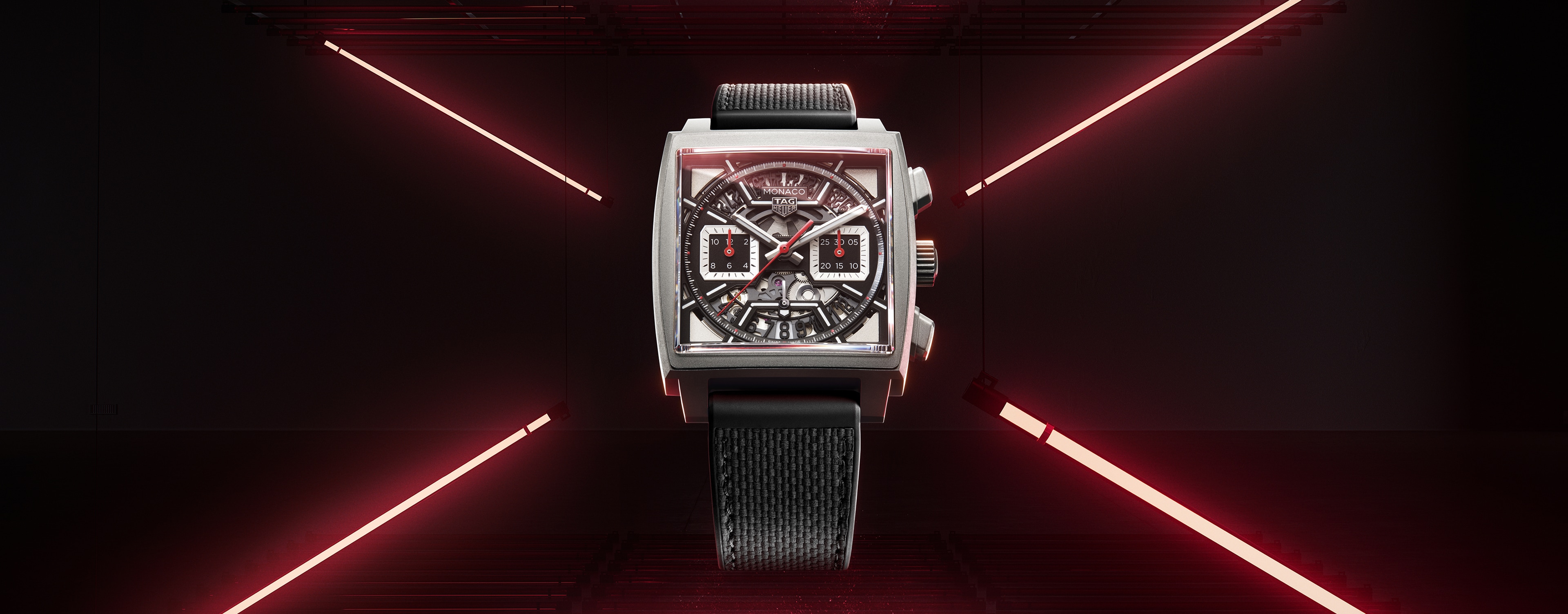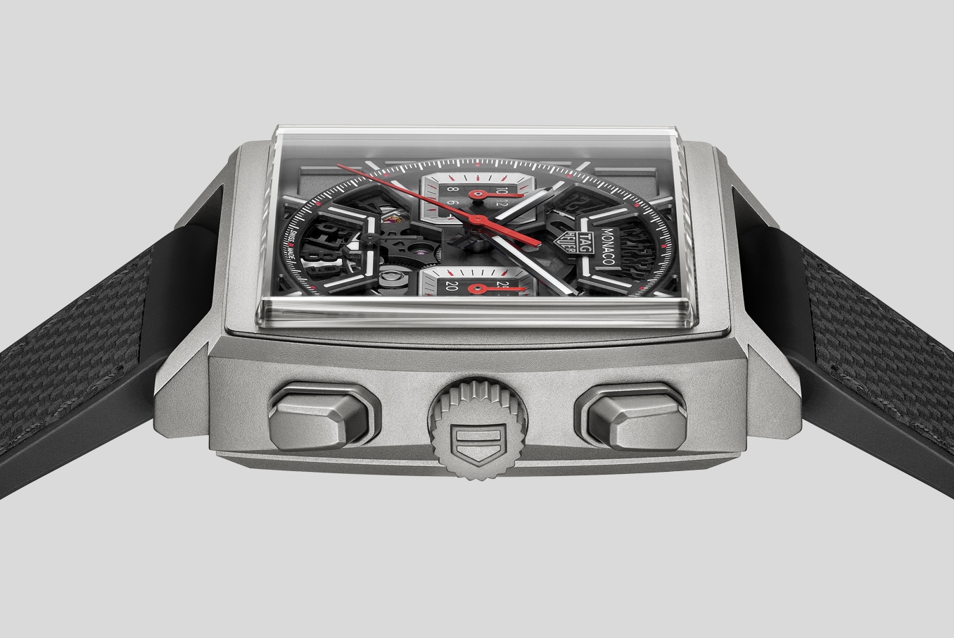 Set against the sandblasted black skeletonised dial, the racing red and white highlights add a defiant edge to this racing-inspired timepiece.
