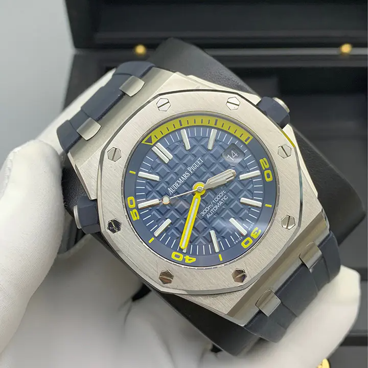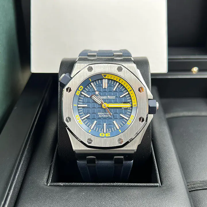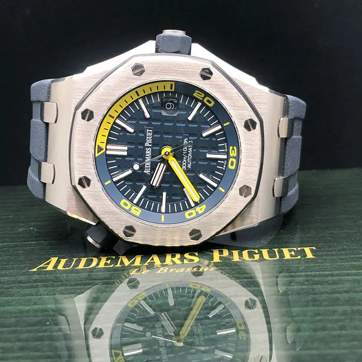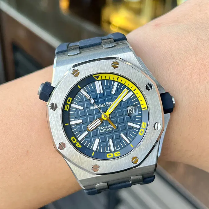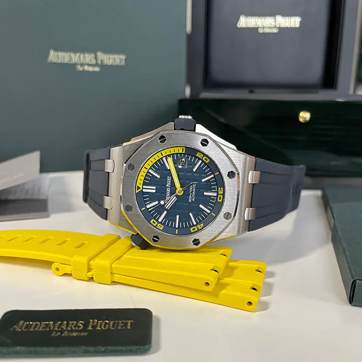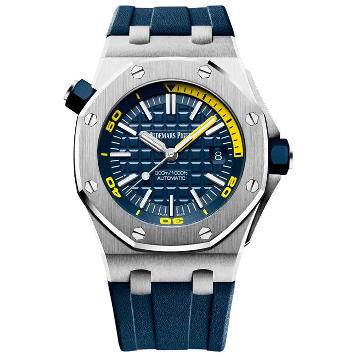 Blue dial with “Méga Tapisserie” pattern, white gold applied hour-markers and Royal Oak hands (yellow minutes hand) with luminescent coating, blue rotating inner bezel with diving scale and zone from 60 to 15 minutes in yellow.