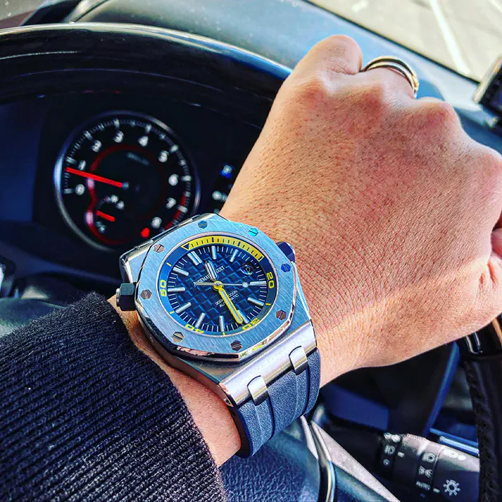 The sleek dark-blue Royal Oak Offshore Diver in the new “Funky Colour” collection, with easy to switch out rubber straps in blue or yellow.