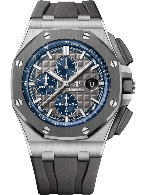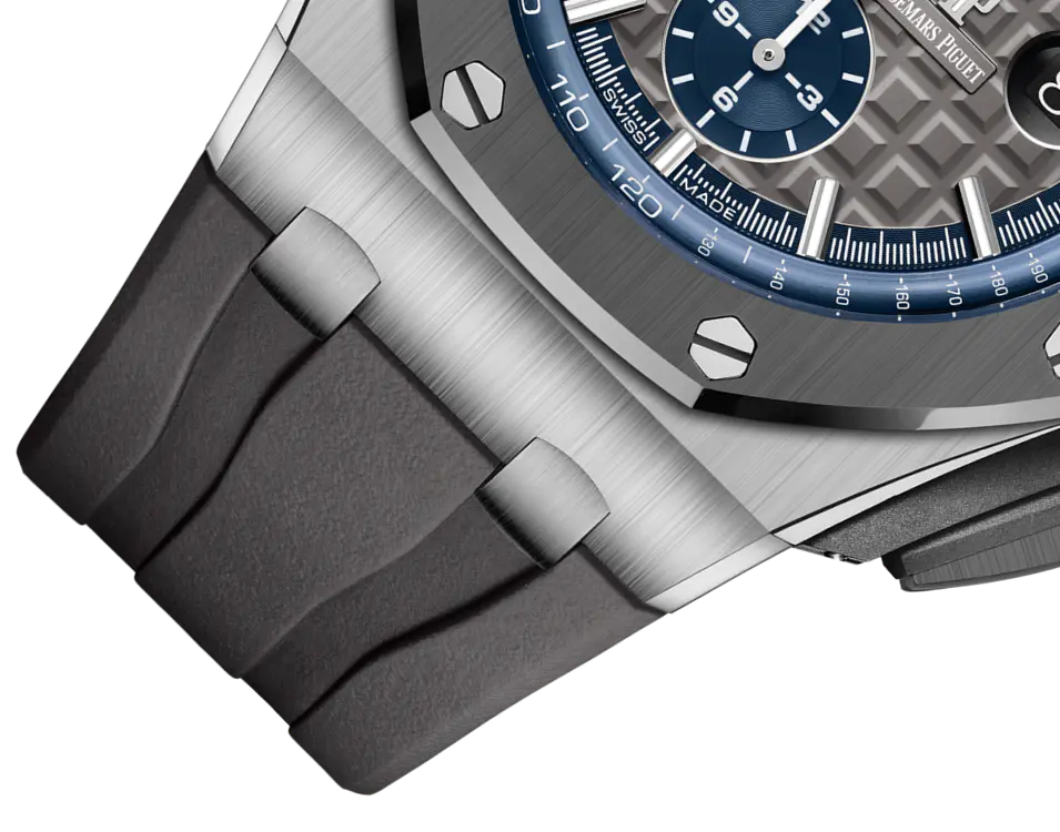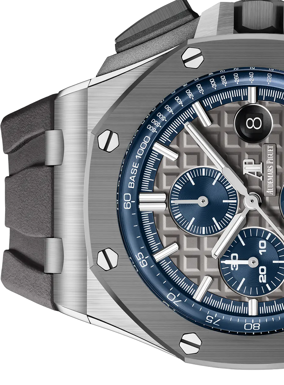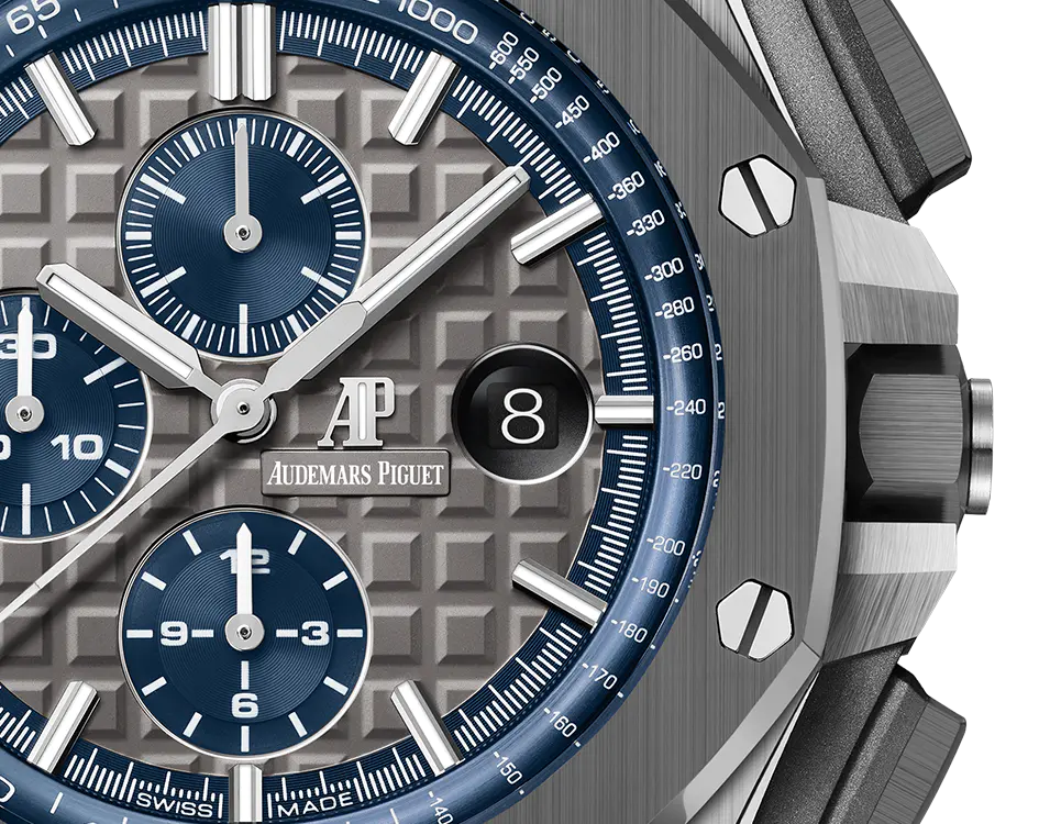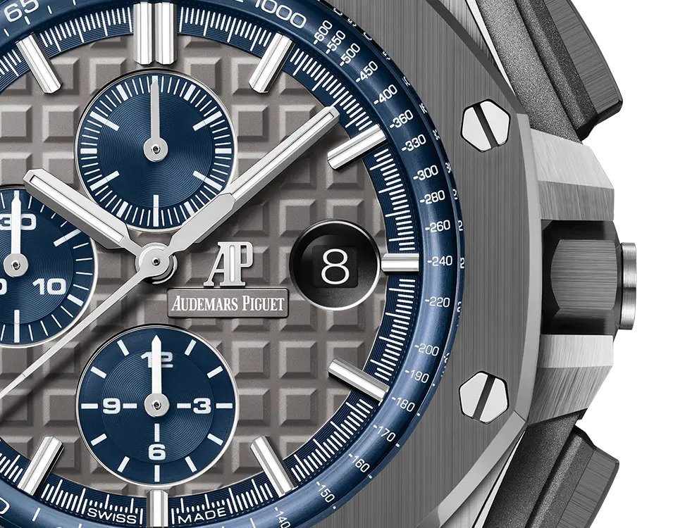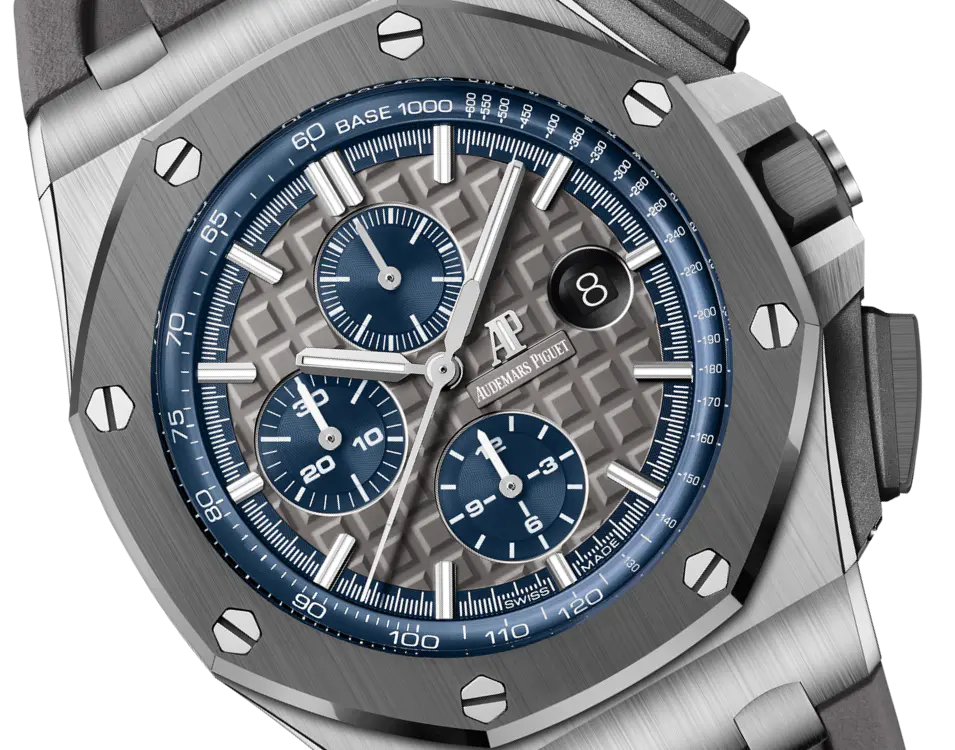 Grey dial with “Mega Tapisserie” pattern, blue counters and blue external zone, white gold applied hour-markers and Royal Oak hands with luminescent coating, blue inner bezel.