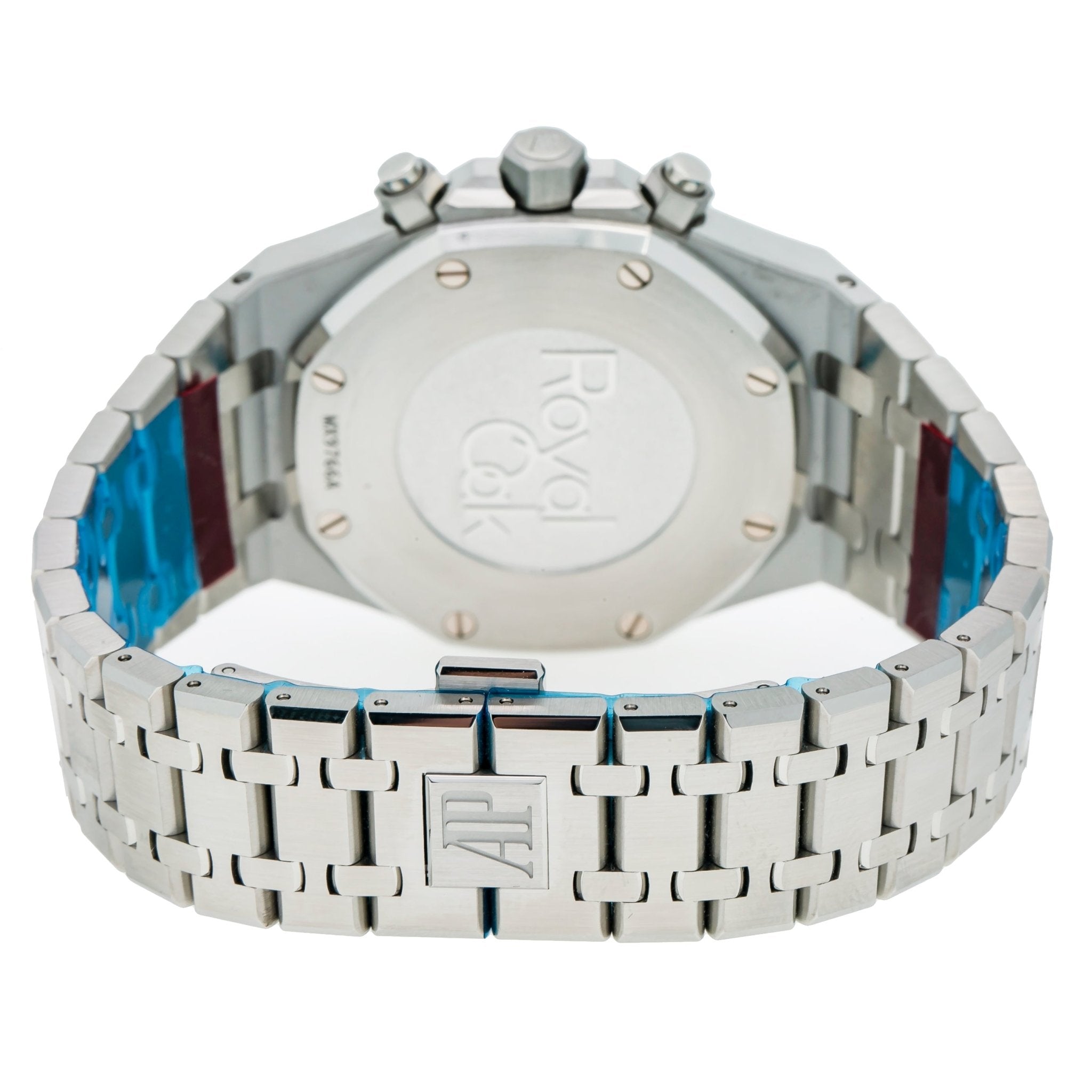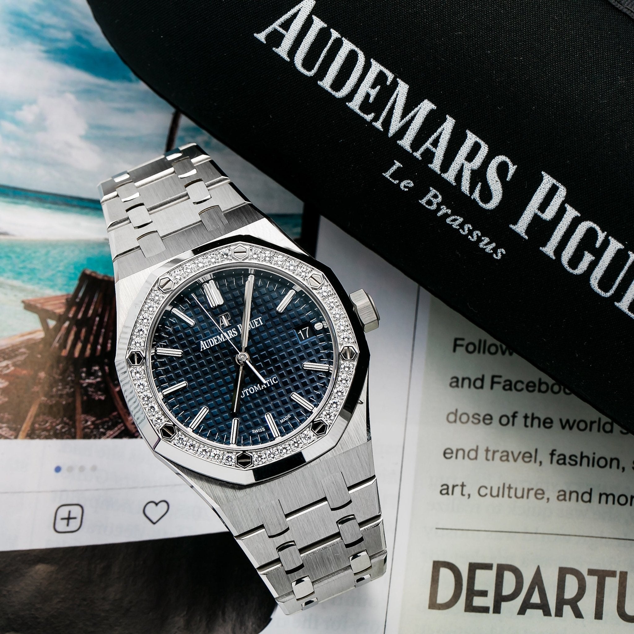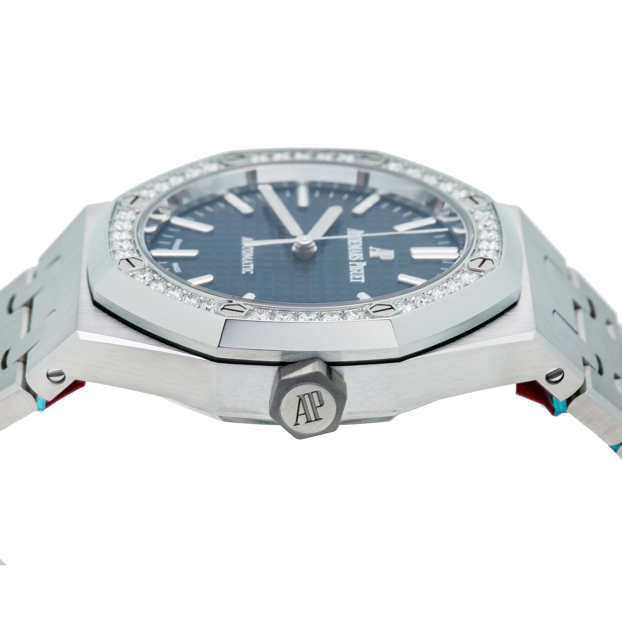 37mm stainless steel case, 9.8 mm thick, glare-proof sapphire crystal back, diamond-set bezel, glare-proof sapphire crystal, blue dial with Grande Tapisserie�� pattern, white gold applied hour-markers and Royal Oak hands with luminescent coating, Calibre 3120 self-winding movement with dive-time measurement, hours, minutes, center seconds and date, approximately 60 hours of power reserve, stainless steel bracelet.
