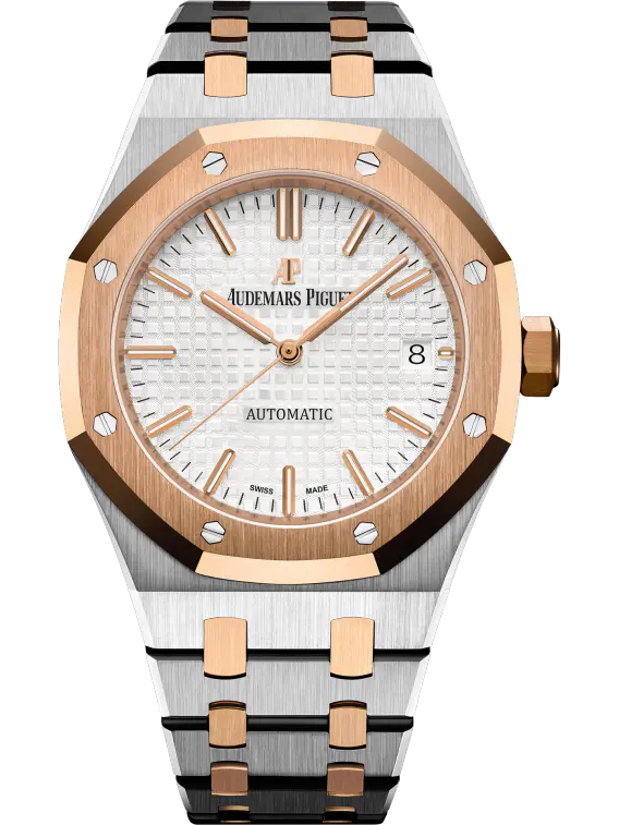 Silver-toned dial with “Grande Tapisserie” pattern, pink gold applied hour-markers and Royal Oak hands with luminescent coating.